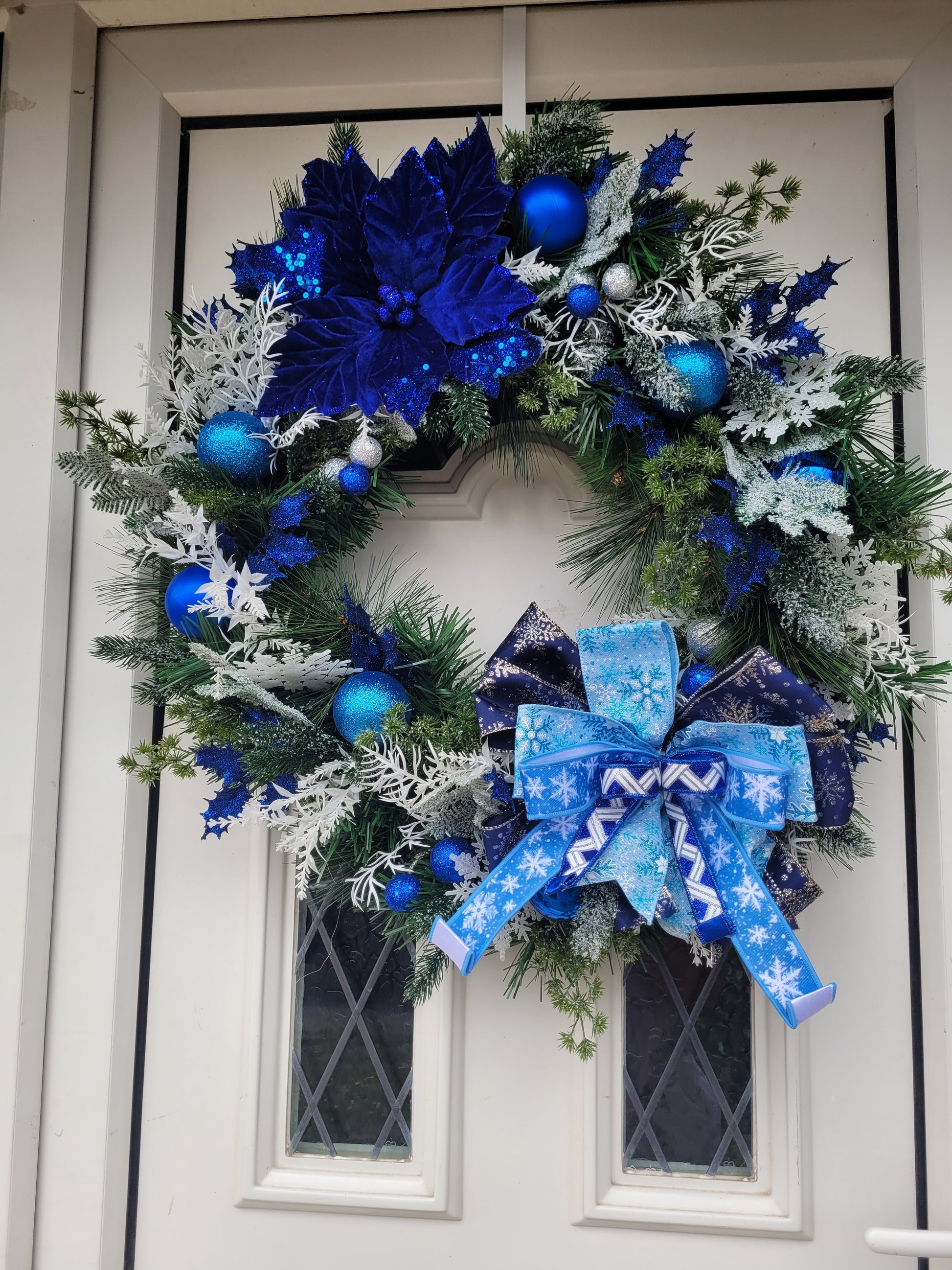 Christmas deluxe wreath size 62cms approximately, blue and silver foliage with exclusive U.S.A ribbons.